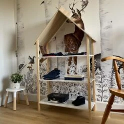 Children’s Bookcase, 3 Shelves And Roof – 79x28x130cm – Tobias – Natural Pine, White