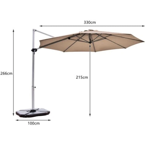 The 3.3m patio offset umbrella provides an ample shade to keep you cool and protect from the hot sun. Made of strong thick aluminum pole and 8 sturdy ribs, the patio offset umbrella is durable enough which has long lifespan. Plus, premium 240gsm yarn-dyed fabric canopy is fade-resistant and water-proof while offer well sun protection. Besides, for maximum convenient, the offset umbrella can rotate 360 degree to your preferred position by simply stepping on the foot pedal and turning the pole with your hands. It is worth mentioning that this round offset umbrella can adjust tilt freely and block the sun at various angles. More, the patio umbrella with a cross base make your umbrella stay firm. By the way, the operation and assembly of the patio umbrella is simple.