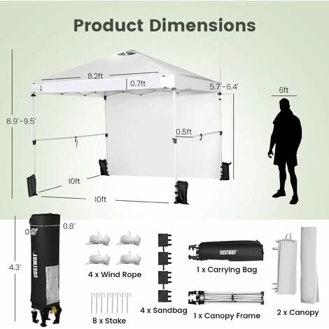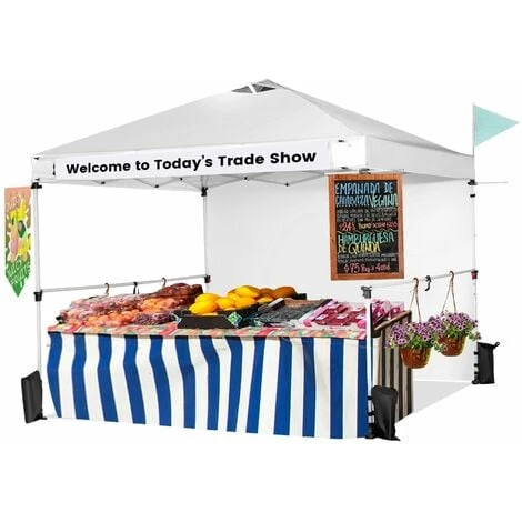 Our commercial instant canopy tent with a sidewall measures 300 x 300 x 270-290 cm (L x W x H) and provides 9 sq. m of shade coverage, allowing you to enjoy comfortable outdoor leisure time with your friends or family. Thanks to the central locking system, the pop-up canopy frame can be easily folded and unfolded in seconds, and it requires no tools. More than that, we also provide a carrying bag to store the folding canopy when not in use, so you can easily transport it anywhere you want. There are 2 built-in wheels on the bottom of the canopy, allowing you to move the folding canopy around easier. Most importantly, our canopy is specially designed for your business and promotion. It comes with multiple crossbars and a banner strip for hanging baskets, clothes, flags, blackboards, banners, and more, making your booth more visible and attractive in the market. The canopy is crafted with durable oxford fabric with PU coating, which features excellent UPF 50+ sun protection, and rain resistance. And the supporting frame is constructed of high-strength powder-coated metal, which is not easy to rust, peel, or chip. In addition, there are wind ropes, stakes, and sandbags for fixing the canopy tent on the ground, adding more stability.