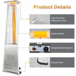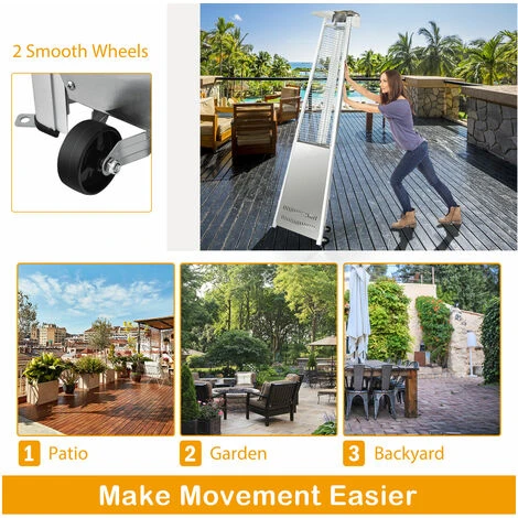 By the quick start of the simple ignition system, this 42,000 BTU patio heater with 360° full-area dissipation can heat up 20 ©O. Through heat-focusing reflective cover and flame emitter, the comfy warmth will be passed on to everyone around it. And the flameout and tip-over protection keep you safe while using it. And the rope is designed for 13 kg propane tank (not included) fixation. When finishing the outdoor gatherings, you can move it easily via 2 smooth wheels.