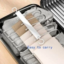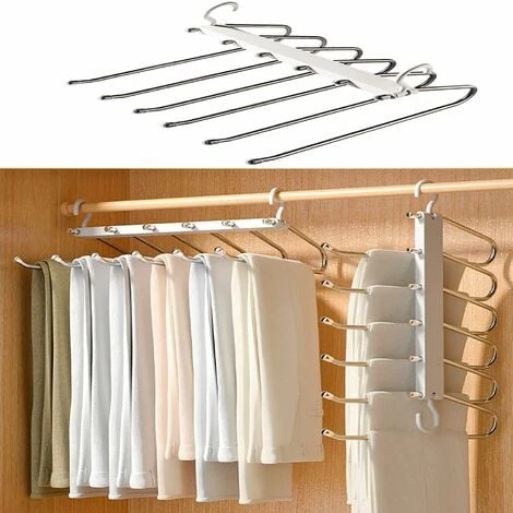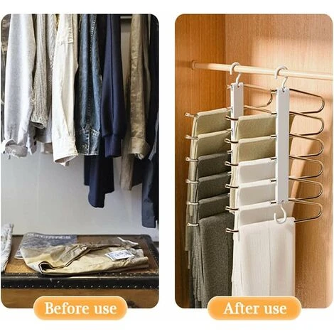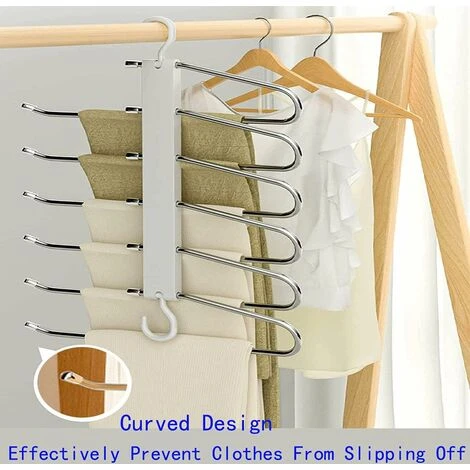 Color as shownSize:35*11*6.5cm Weight:370 grams6 in 1: It can hold 6 pants at a time.You can hang jeans, pants, ties, etc. There are two hanging options: horizontally or vertically.Hanging it vertically can save space for 5 pants. Premium Quality: The pants hanger is made of high quality stainless steel, safe and stable, very portable, rust-resistant, not easy to break and not easy to deform.It can be used for a long time.There are 2 hooks attached to the hangers.It can be hung horizontally or vertically.With double hanging, clothes dry easily.Single hook, save your wardrobe space Non-slip design: The curved design of the stainless steel tube can effectively prevent the clothes from slipping, and the non-slip transparent cap can prevent the clothes from being scratched.You don’t have to worry about ruining your wardrobe.The hook has strong bearing capacity and is strong and easy to use. Wide Application: Perfect for pants, dresses, towels, sweatpants, scarves, dresses, ties and more.The chest and trousers can be stowed away without having to rearrange them.Just hang it up when you’re out.Suitable for bathrooms, apartments and more.