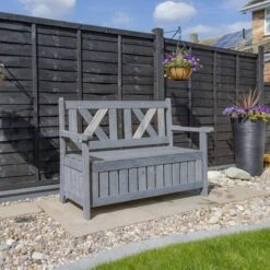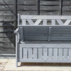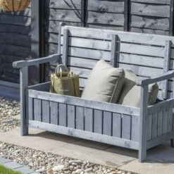 Highly durable and long-lasting, this grey garden storage bench is crafted from high quality Chinese fir wood. The wood of this garden storage bench has been pressure treated to prevent unwanted damage caused by rot and termites. Alongside its sturdy components, the seat of the storage bench also boasts a high and supportive back to champion comfort as well as stability and strength.