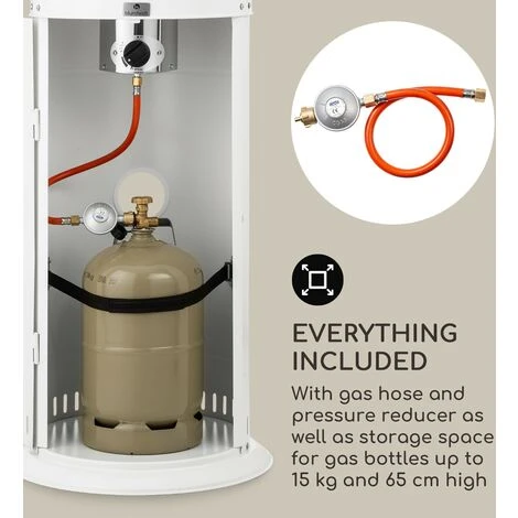 Everything is included: a gas hose and pressure regulator as well as storage space for gas bottles up to 15 kg and 65 cm high