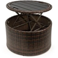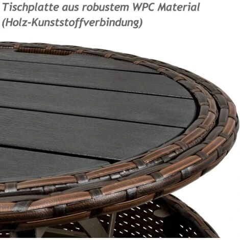 The WPC telescopic table is made from a robust wood-plastic compound and can be extended quickly and easily. The tabletop can also be used as a tray and has 3 non-slip and height-adjustable plastic feet for safe storage. The table also has an extra inner floor made of poly rattan. The interior can also be used as storage space.