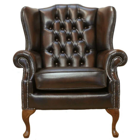 Our winged high-back Chesterfield Queen Anne Armchair with exposed hardwood leg detail. A very popular look in the Queen Anne Style