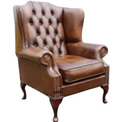 Our winged high-back Chesterfield Queen Anne Armchair with exposed hardwood leg detail. A very popular look in the Queen Anne Style.