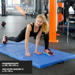 The four sections of our tumbling mat are made of soft EPE foam (expanded polyethylene), the high quality PVC coating not allows sweat and saliva to go through. Overall dimension: approx. 200x100x5cm, folded dimension: approx. 50x100x20cm, weight: approx. 3,25kg.