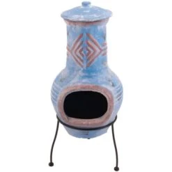 - Including a solid, black powder-coated steel stand and a clay chimney lid