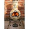 - Including a solid, black powder-coated steel stand and a clay chimney lid