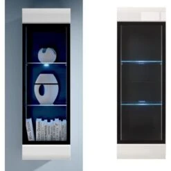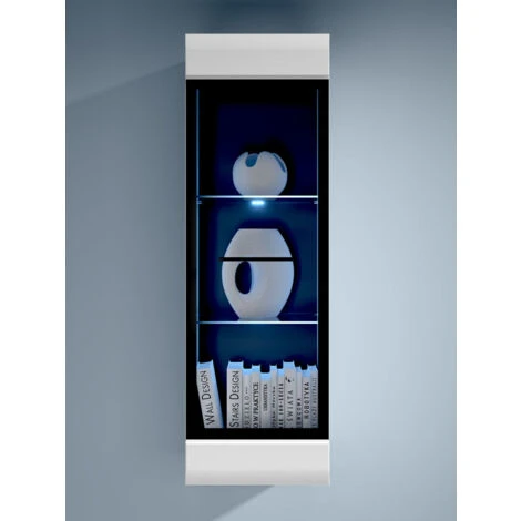 Modern White High Gloss Tall Wall Mounted Glass Display Cabinet Unit with LED Light