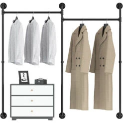 Compact industrial pipe garment rack for hanging clothes, elegant black color, durable materials. Wall mounted design won’t occupy much space in your small apartments or condos, it also costs less than an expensive closet.