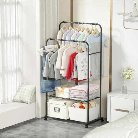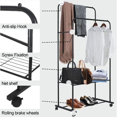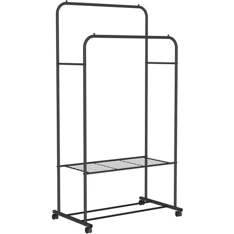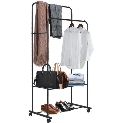 Great for those who need extra hanging storage space, this attractive and functional garment rack is a nice addition to any laundry room, bedroom, or dorm room. Smooth rolling casters allow the rack moves easily from room to room. Features an adjustable hanging bar that raises to accommodate long dresses or coats and extends in width for extra hanging space. And the two lower bars can be used for extra storage.