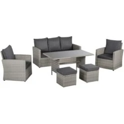 • Set comes with two armchairs, two footstools, a three-seater sofa and tempered glass dining table