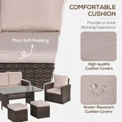 • Set comes with two armchairs, two footstools, a three-seater sofa and tempered glass dining table