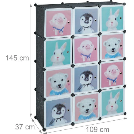 The large children’s shelf with cute animal prints will delight children and creates order. The wardrobe for the children’s room has 6 cube compartments and 2 high compartments with clothes rails. The doors of the black wardrobe show different animals, including penguin, piglet, polar bear and rabbit. The cute cartoon characters will delight boys and girls alike. The standing shelf is based on a plug-in system and can be put together as desired.