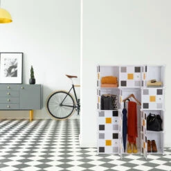 The individual plug-in shelving system is the ideal storage option for clothes, home textiles and other items. The shelving system made of plastic panels and plug-in connections allows you to build it up in height or width – as you wish. Thanks to the 2 clothes rails, bags, scarves and hats can be hung up neatly. The individual plug-in system is the ideal choice for anyone who has to move frequently or likes to rearrange things. The storage cupboard is versatile.