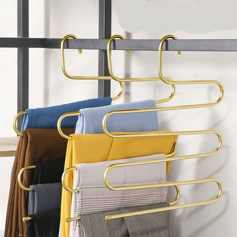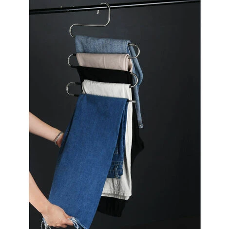 Space-saving trouser hanger – 5 tier hangers. Each hanger can hold at least 5 jeans, pants or other clothes. Save space in your closet and keep it clean and tidy. Strong load-bearing capacity and not easy to deform