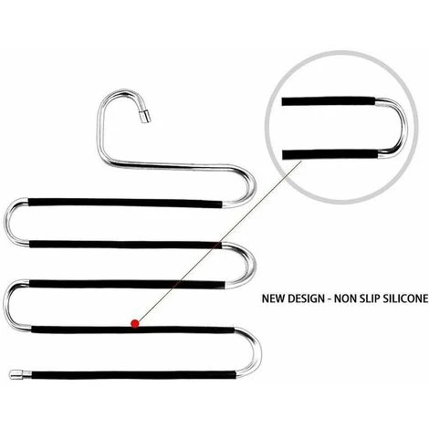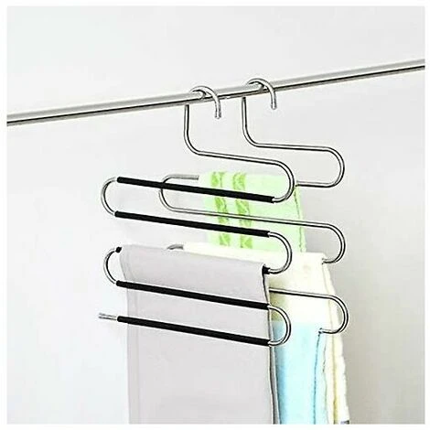 “Space-saving hangers: 5 tiers. Each hanger can hold at least 5 pairs of jeans, pants or other clothing items. Maximize your closet space and keep it clean and tidy. Strong strength and not easily deformed. Stainless steel hangers and trousers. Made of high quality stainless steel, sturdy and durable. Rust-resistant and robust construction. Smooth and scratch-resistant surface. Protect your pants and clothes from scratches and wrinkles Plastic to prevent clothes from falling off the hanger. Makes it compact and organized. Keep pants neat and organized on sticks and tidy. You will love that you can hang more pants and save space. Easy to use: compatible with all kinds of clothes. Perfect for hanging your jeans, trousers, ties, scarves, etc. Save space in your closet and s provide more space to put other things. Don’t worry about the deformation of the pants rack, always durable and keep a good shape thanks to its excellent quality.”