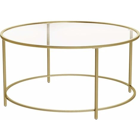 The round gold frame made of powder-coated iron and the glass element create an unmistakable contemporary look, which fits both in stylish rooms with a large upholstered couch and carpet and in rooms with minimalist furnishings.