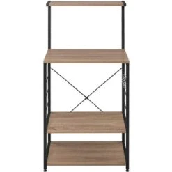 Good material and strong structureThe shelves are made of wood. Structure is made of strong steel | Floor ProtectionEach leg was designed with a pad to protect your floor and anti-slip | Reasonable designDesigned with 4 strong hooks. you can hang your spoons . truner or cups. easy to organize your kitchen and living room. |