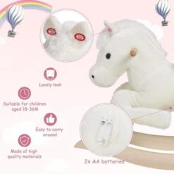 Safety firstWooden rocking horse seat with sides and adjustable seat belt makes it safer for children to use. The handles on either side are smooth and easy to grasp. and the footrests provide further support for their legs. Mom and dad don’t have to worry about their kids. | Solid wood baseThe rocking base is crafted from solid wood in a gently curved shape. allowing kids to move backwards and forwards smoothly without tipping over. It was approved by CE-EN71 and EN62115. | The simulated soundTwo ears are equipped with sound buttons. When little one presses the left or right ear. the infant rocking animal will make a running or neighing sound. The sound paper in the horse mane can also attract children’s desire to explore and interact. | BatteriesThe battery case is at the bottom of the horse’s belly. Turn the horse upside down and you will find it. This rocking horse only needs 2 AA batteries to activate the sound function. your child will have a lot of fun |