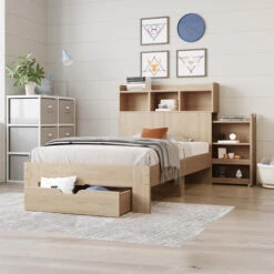 ✅Lively display:Let your favourite items be showcased with the shelves on the headboard of the bed. There are three open storage compartments at the head of the bed. The pull-out drawer on castors at the foot of the bed provides additional storage space and keeps the room neat and tidy. This design is suitable for both adults and children.