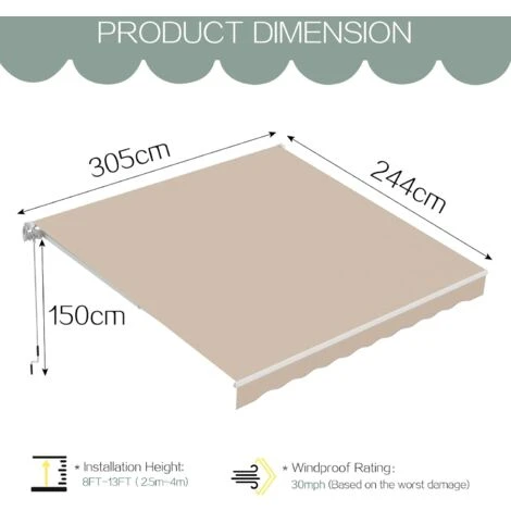 YODOLLA 3 × 2.5m Patio Awning Retractable Sun Shade With Manual Crank Handle, Beige