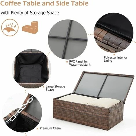 Waterproof Storage Space: Coffee table and side table with plenty of storage space come with waterproof covers inside and PVC panel at the bottom. Cushions can be put in for storage to keep dry when it rains or snows.