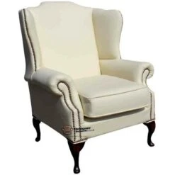 Chesterfield Mallory Saxon Flat Wing High Back Wing Chair UK Manufactured Cottonseed Cream Leather